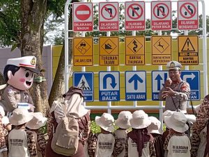 Dalam kesempatan tersebut, petugas memperkenalkan berbagai rambu-rambu lalu lintas serta memberikan sosialisasi keselamatan berkendara, meliputi cara aman menyeberang dan perlengkapan keselamatan wajib seperti helm SNI, jaket, celana panjang, sepatu, sarung tangan, serta masker.
