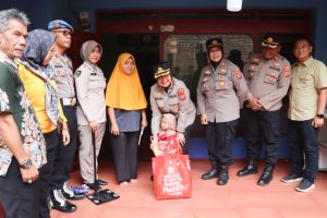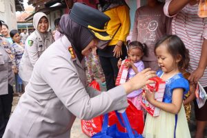 Bahkan, Kombes Pol Sumarni, S.I.K, S.H, M.H, juga turut menyapa warga Kelurahan Gegunung dan membagikan bantuan makanan sehat berupa susu hingga biskuit kepada anak-anak yang ditemui di sepanjang jalan di kawasan tersebut.