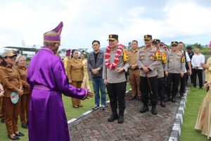 Kedatangan Kapolda beserta rombongan disambut Kapolres Kepulauan Talaud AKBP Arie Sulistyo Nugroho, SIK,MH serta Forkopimda Talaud dengan hangat melalui Pengalungan Bunga, dilanjutkan dengan upacara adat serta Tarian Bara’a hal ini menunjukkan penghormatan dan keakraban budaya daerah.