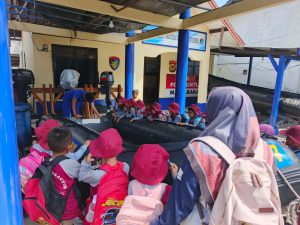 Sebanyak 34 anak didampingi 4 guru pembimbing disambut hangat oleh personel Satpolairud. Dalam kesempatan tersebut, anak-anak diperkenalkan berbagai materi seputar tugas pokok dan fungsi Satpolairud, seragam dinas kepolisian, serta sejumlah peralatan utama di antaranya Kapal C2, perahu karet (rubber boat), kendaraan dinas, jaket pelampung, dayung hingga ring buoy.